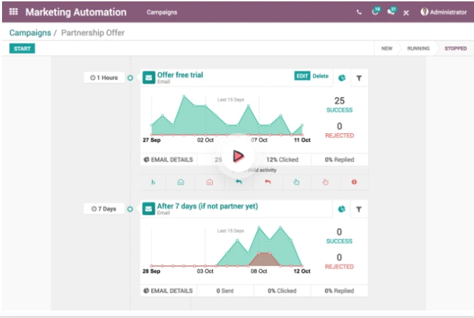 Jalankan aktivitas marketing secara terstruktur, terukur, dan terintegrasi dengan Odoo Marketing Automation, sehingga tim marketing dapat fokus membangun relasi dengan prospek dan pelanggan, bukan mengelola campaign yang terpisah-pisah.